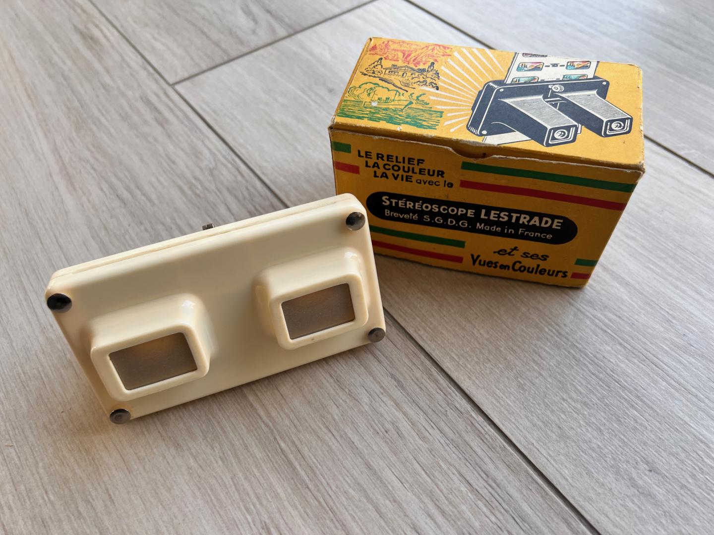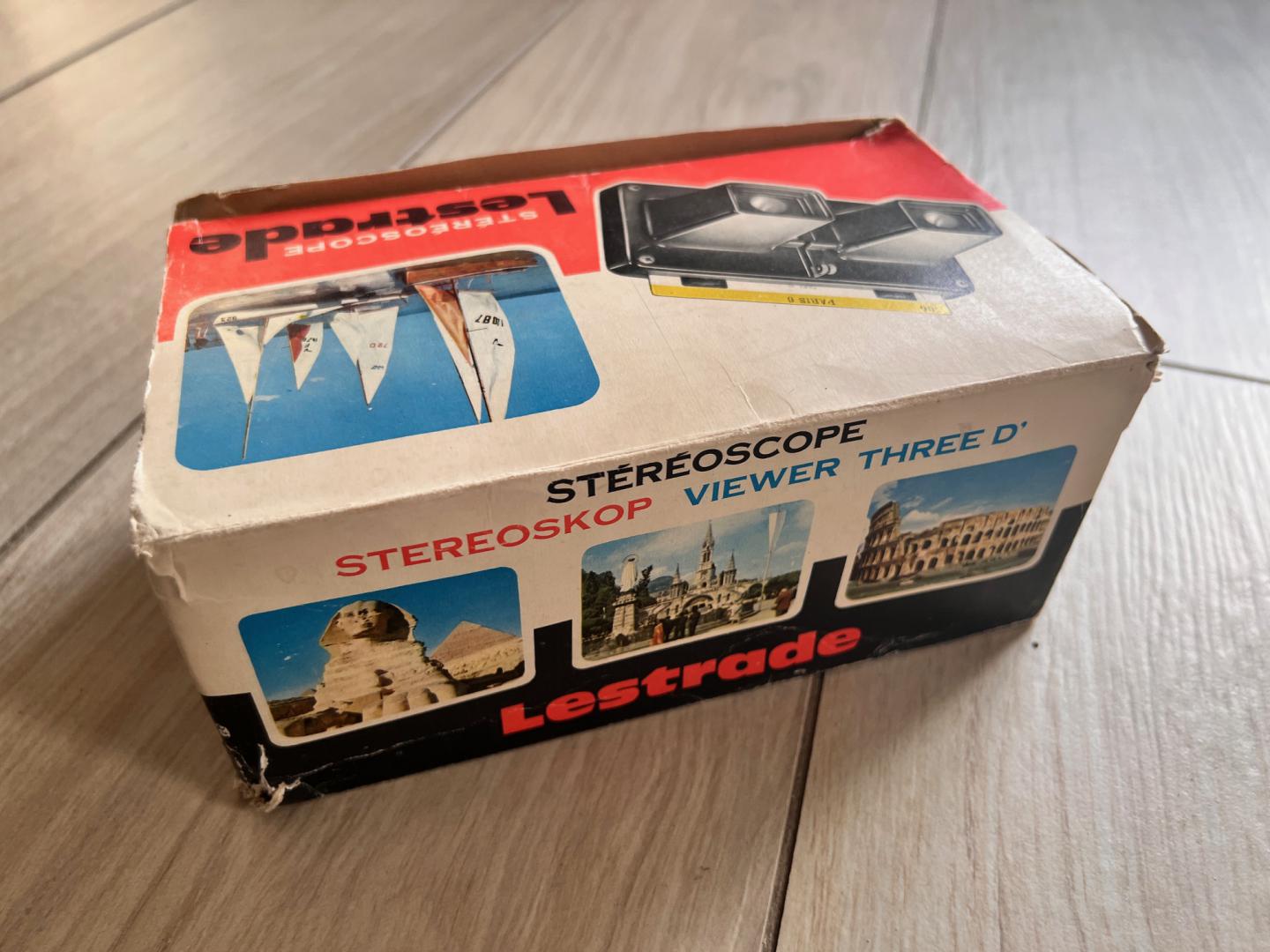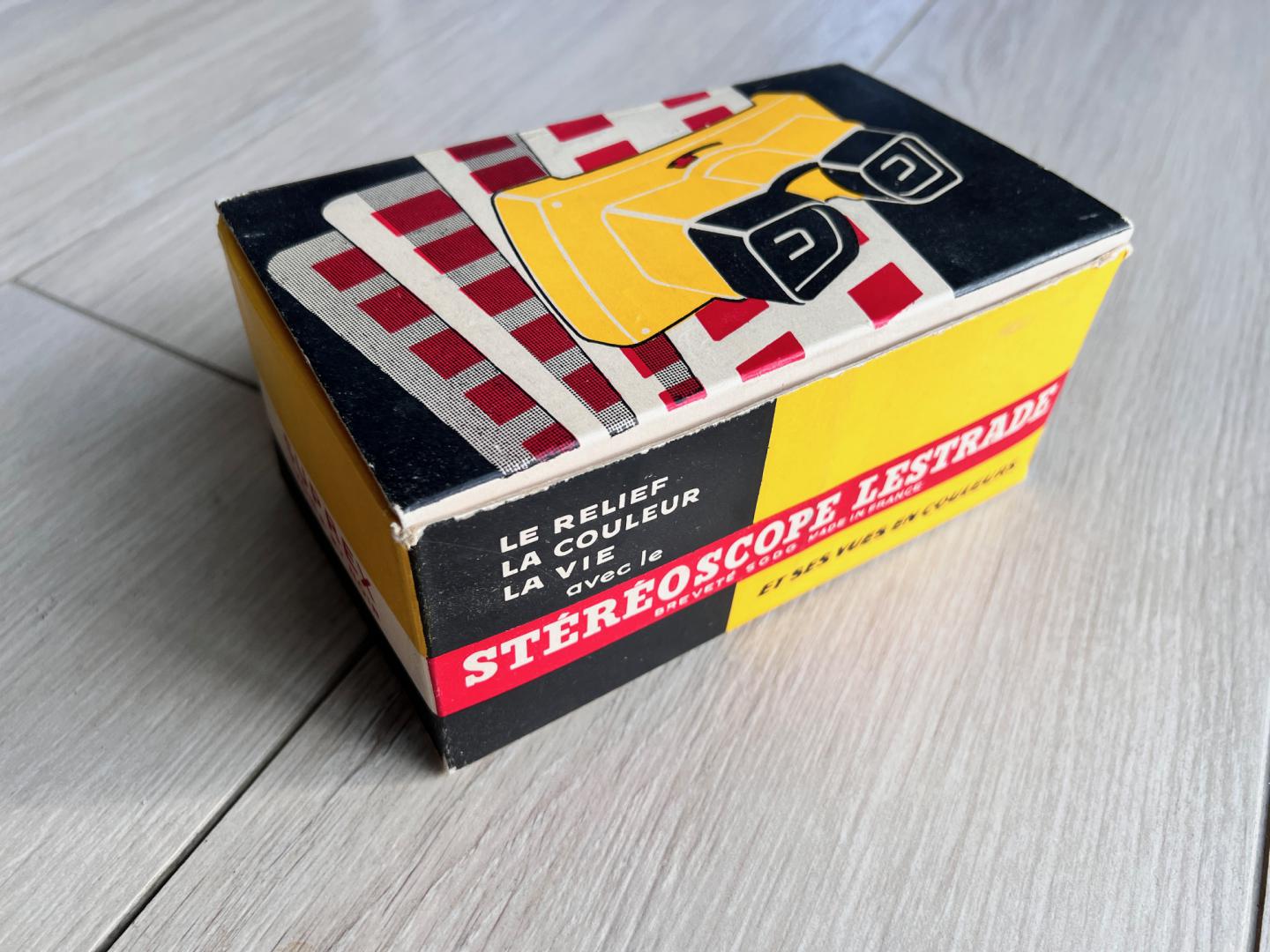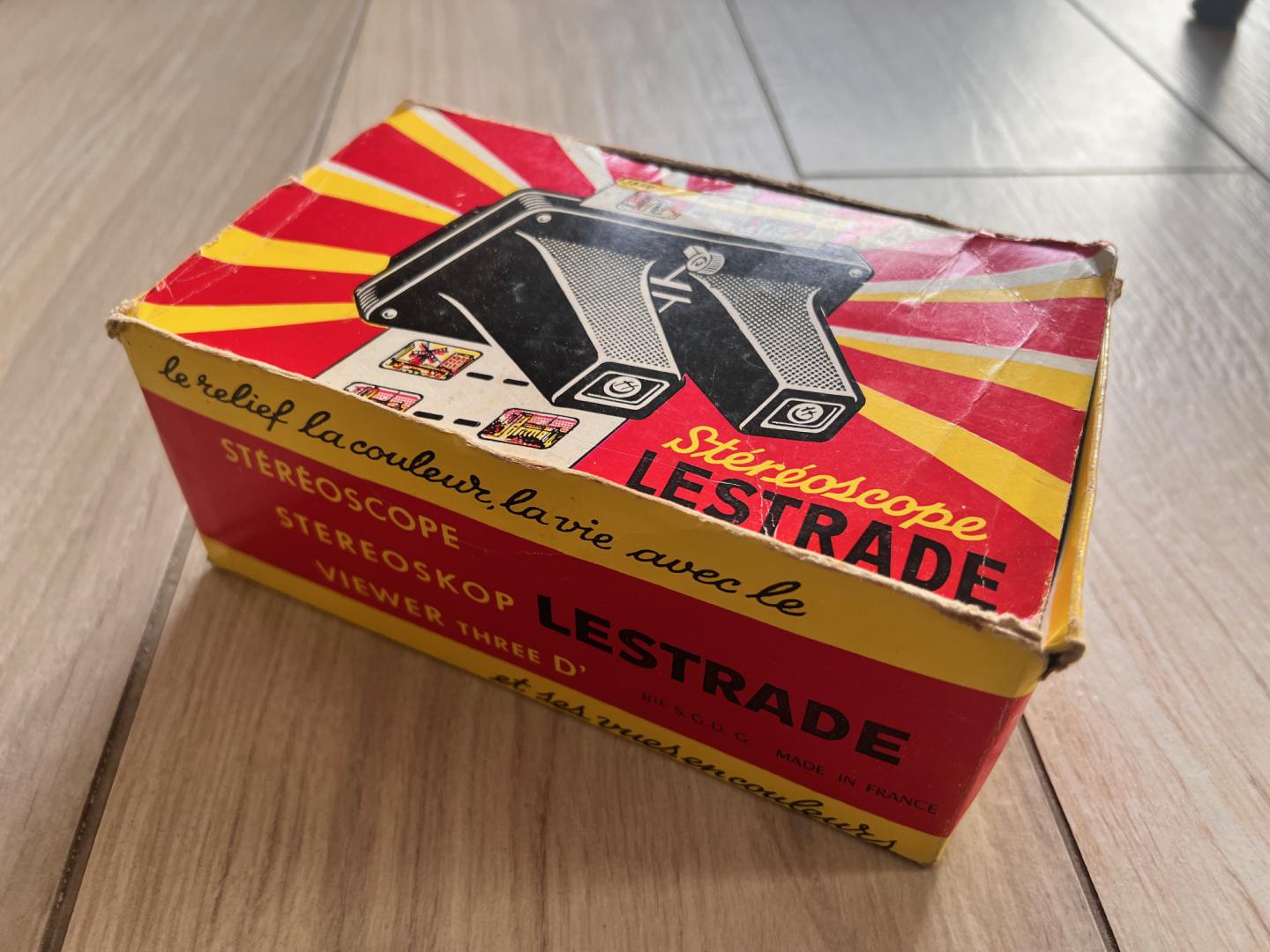 Les premiers stéréoscopes LESTRADE sont commercialisés dans les années 1954. Ils sont présentés dans une petite boîte en carton sous le slogan : "LE RELIEF, LA COULEUR, LA VIE avec le STÉRÉOSCOPE LESTRADE , et ses vues en couleurs". Sur le couvercle se trouve la notice d'utilisation, l'emplacement pour le tampon du revendeur.