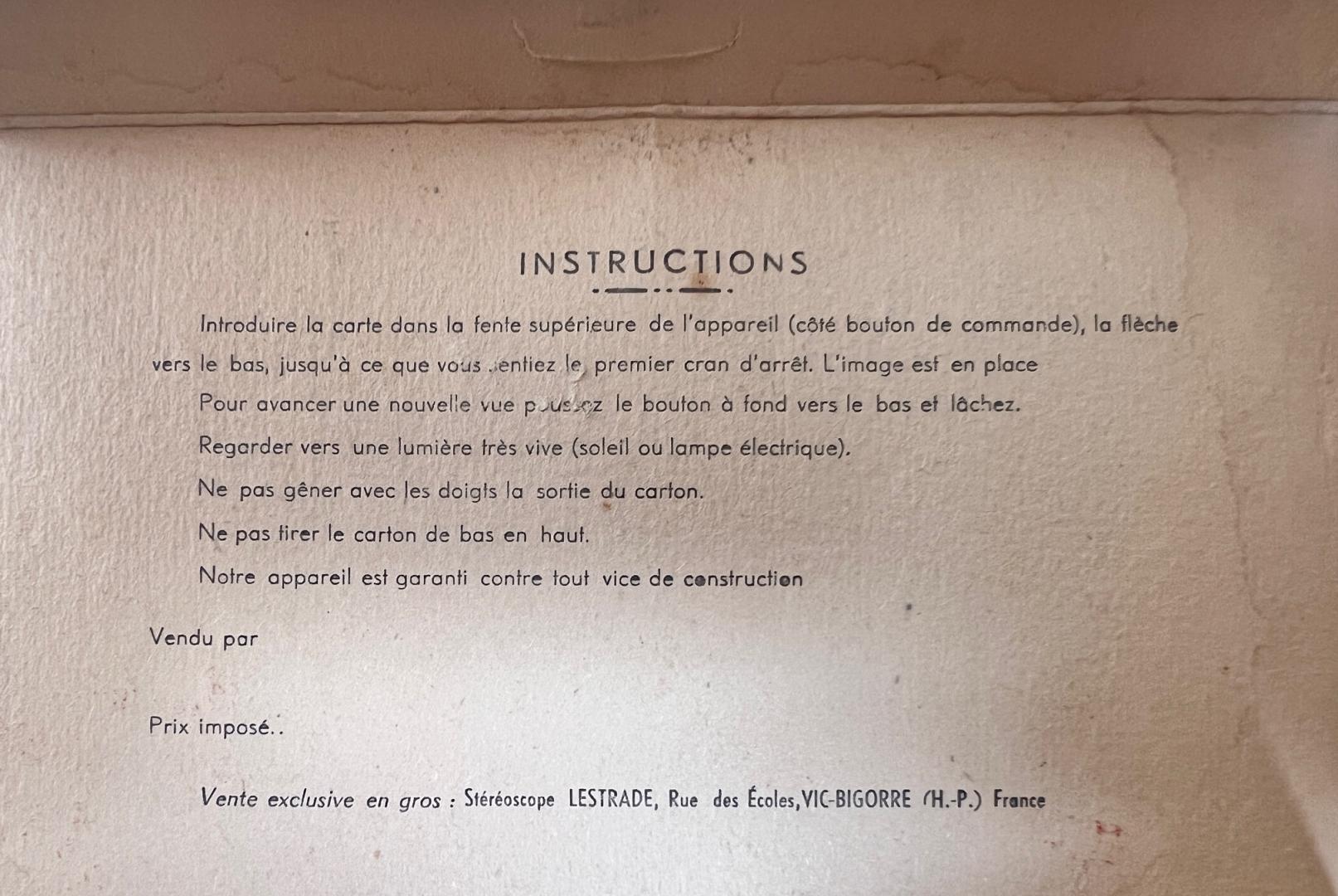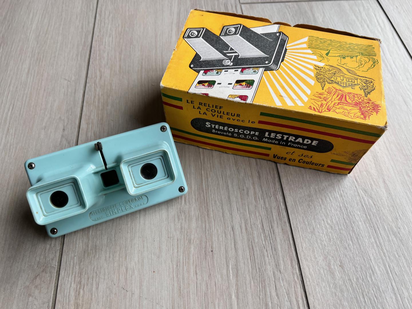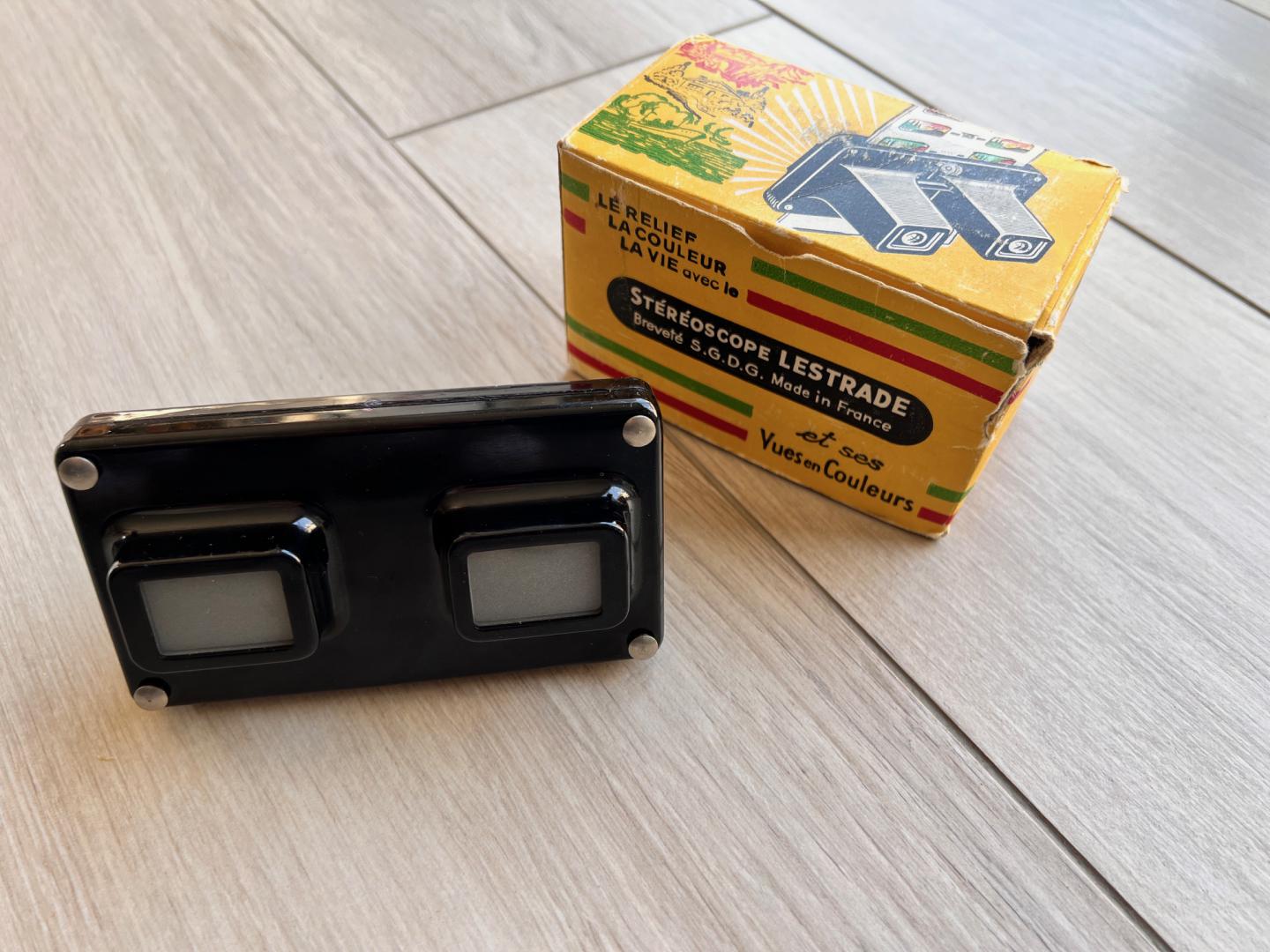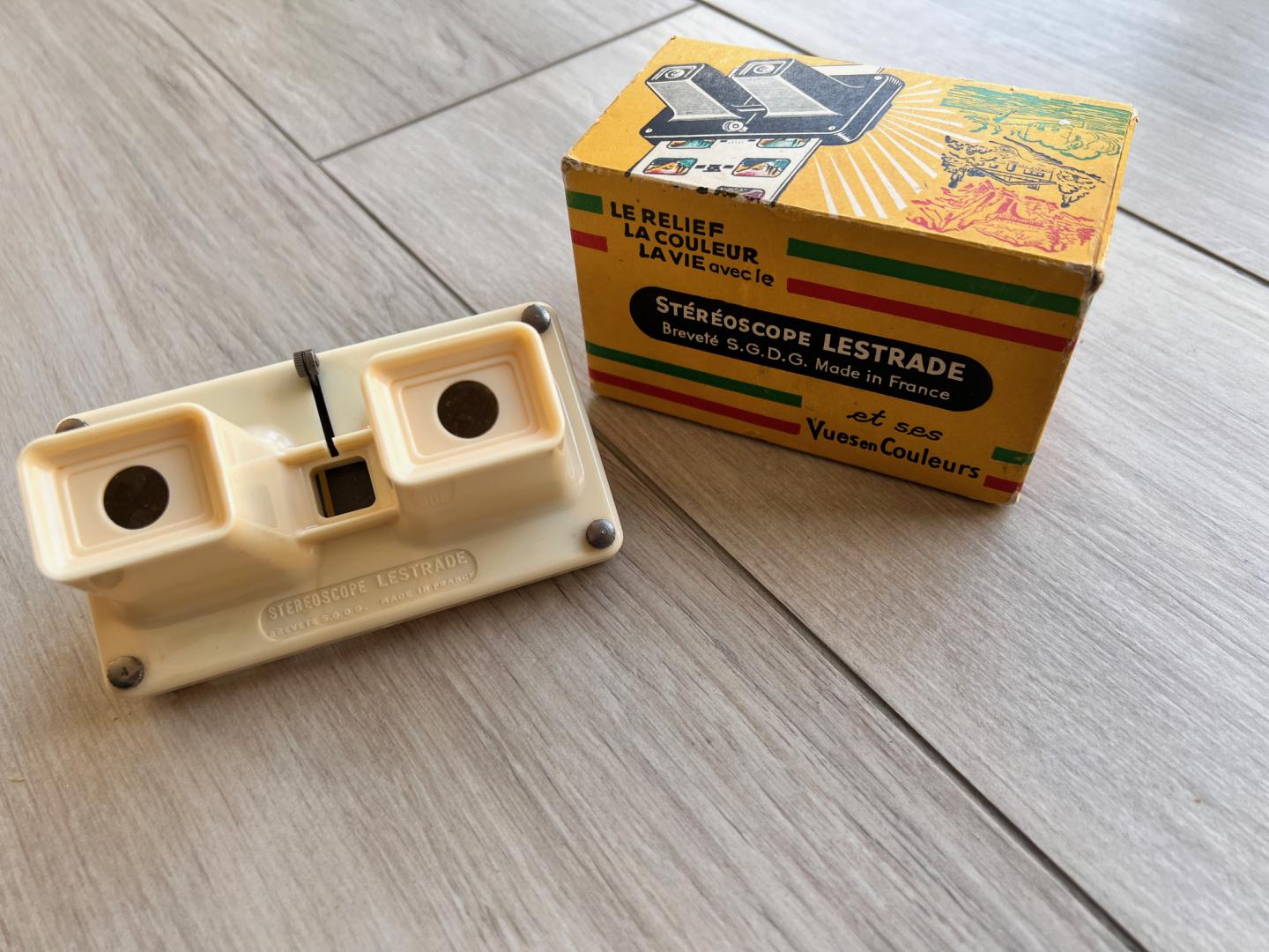 Les premiers stéréoscopes LESTRADE sont commercialisés dans les années 1954. Ils sont présentés dans une petite boîte en carton sous le slogan : "LE RELIEF, LA COULEUR, LA VIE avec le STÉRÉOSCOPE LESTRADE , et ses vues en couleurs". Sur le couvercle se trouve la notice d'utilisation, l'emplacement pour le tampon du revendeur.