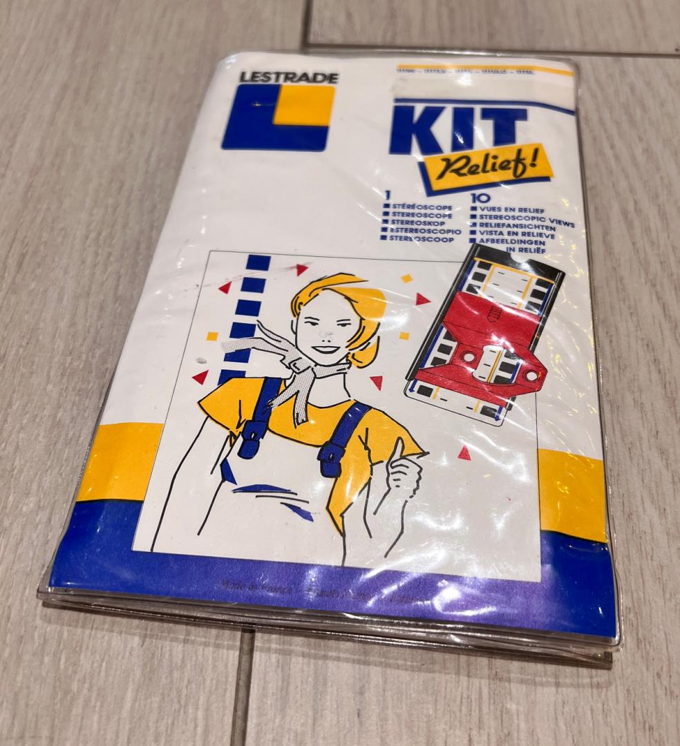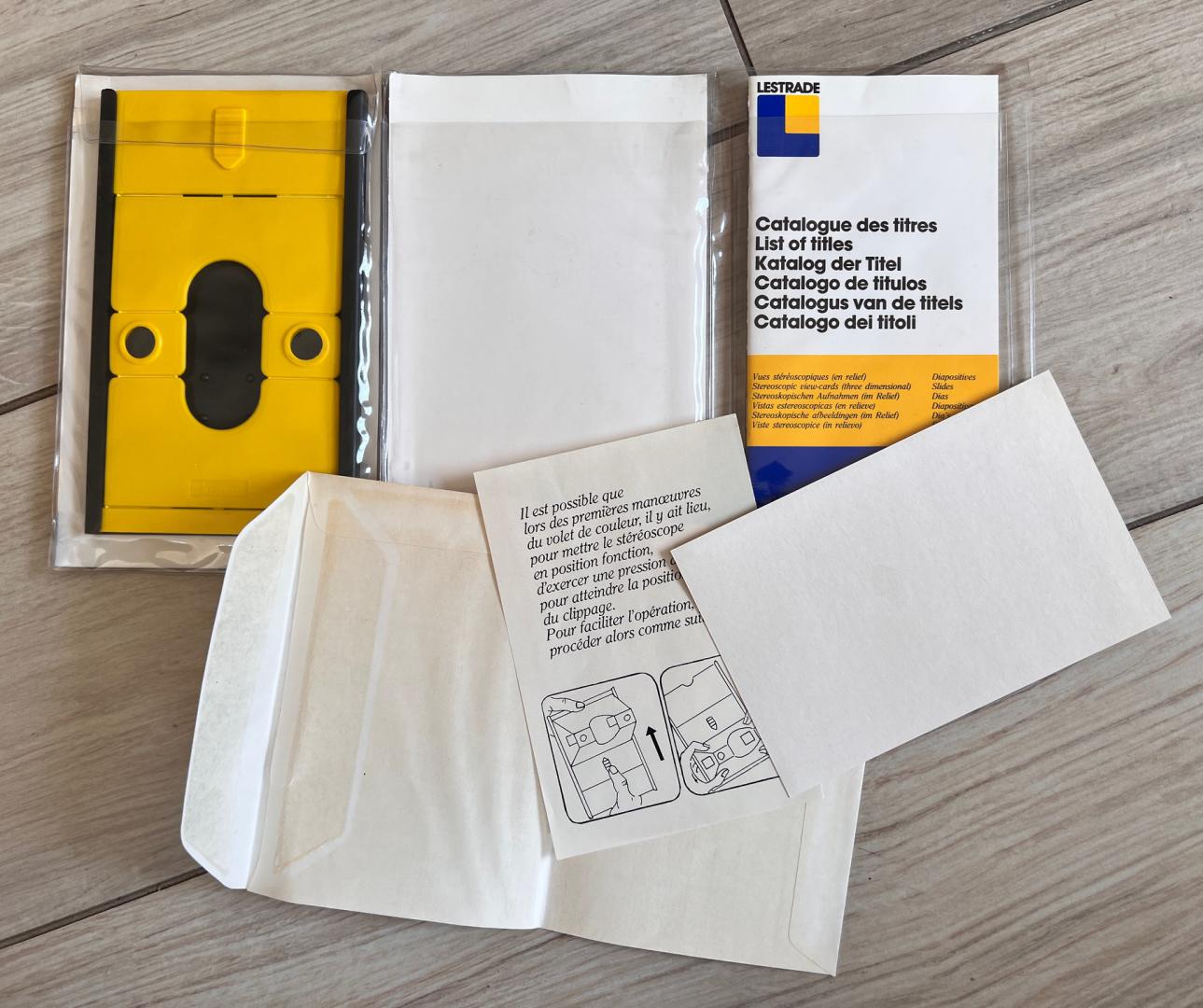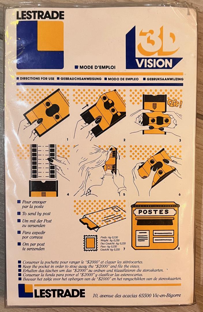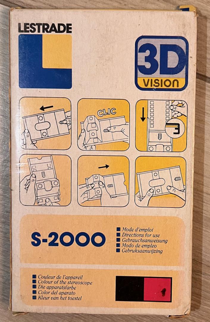 Le packaging est adapté au nouveau modèle, il intègre toujours le même slogan : "LE RELIEF, LA COULEUR, LA VIE avec le STÉRÉOSCOPE LESTRADE, et ses vues en couleurs"