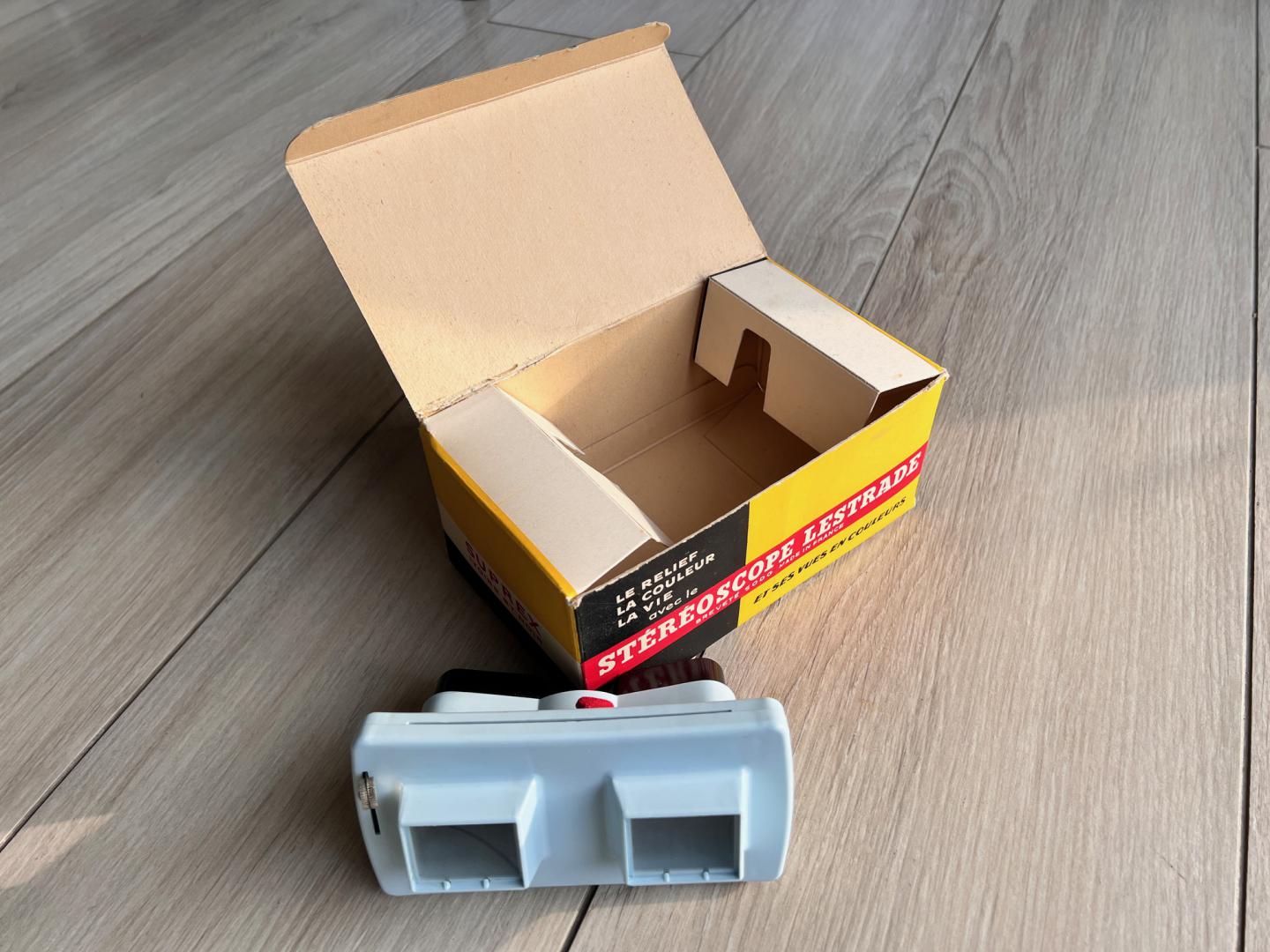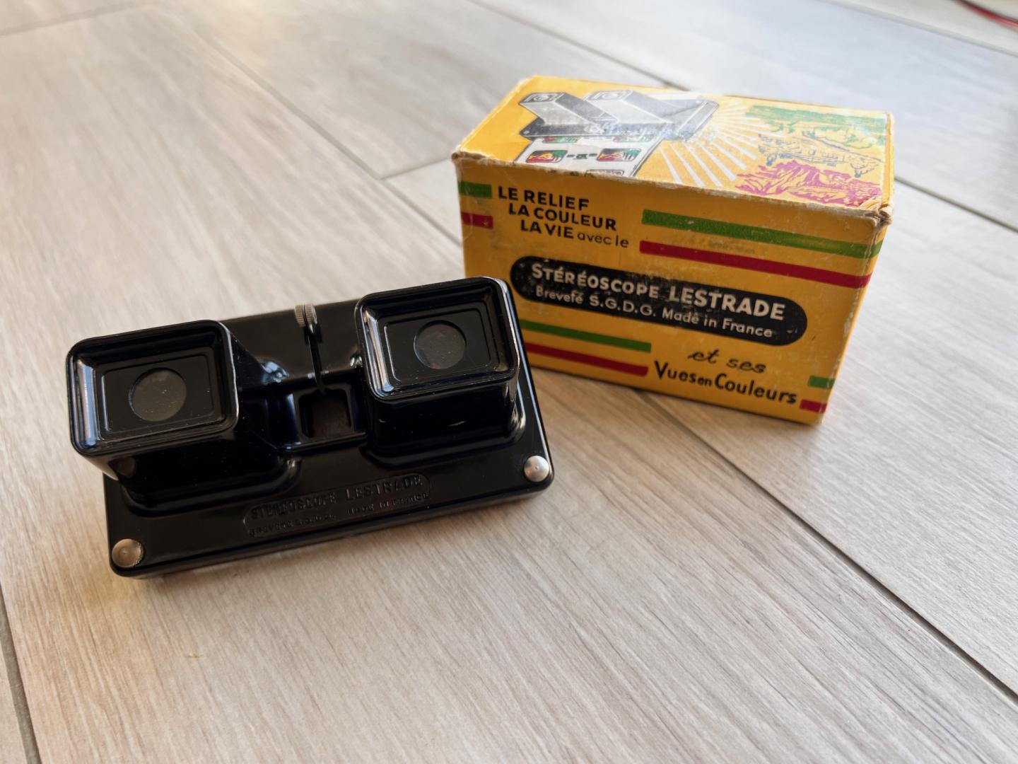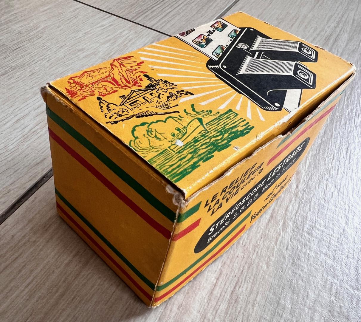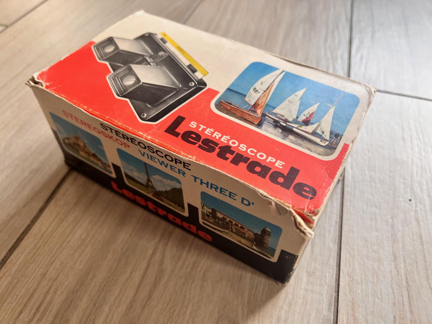 Les premiers stéréoscopes LESTRADE sont commercialisés dans les années 1954. Ils sont présentés dans une petite boîte en carton sous le slogan : "LE RELIEF, LA COULEUR, LA VIE avec le STÉRÉOSCOPE LESTRADE , et ses vues en couleurs". Sur le couvercle se trouve la notice d'utilisation, l'emplacement pour le tampon du revendeur.