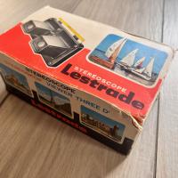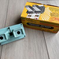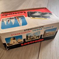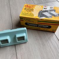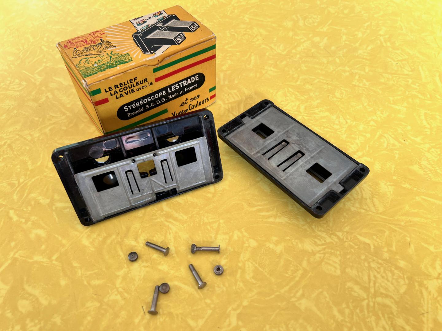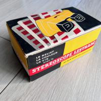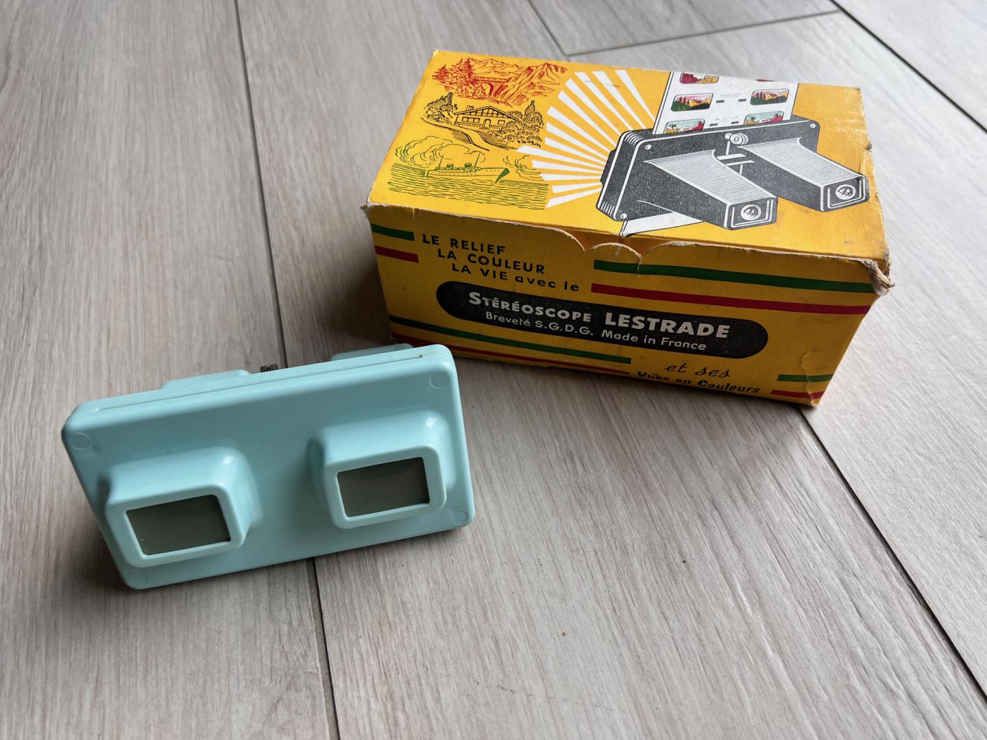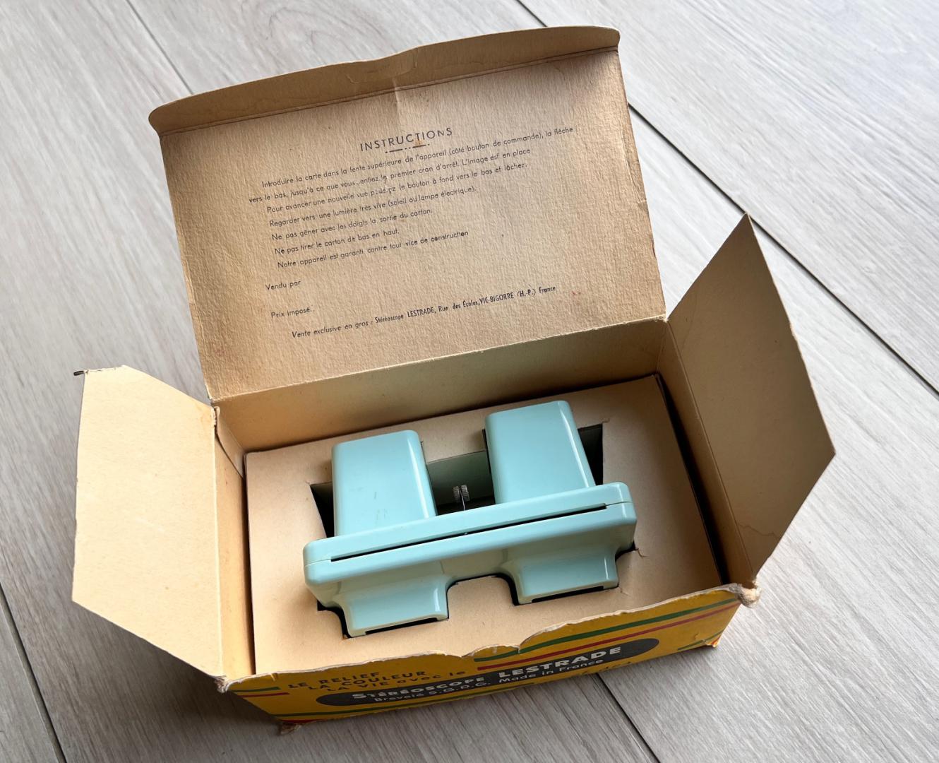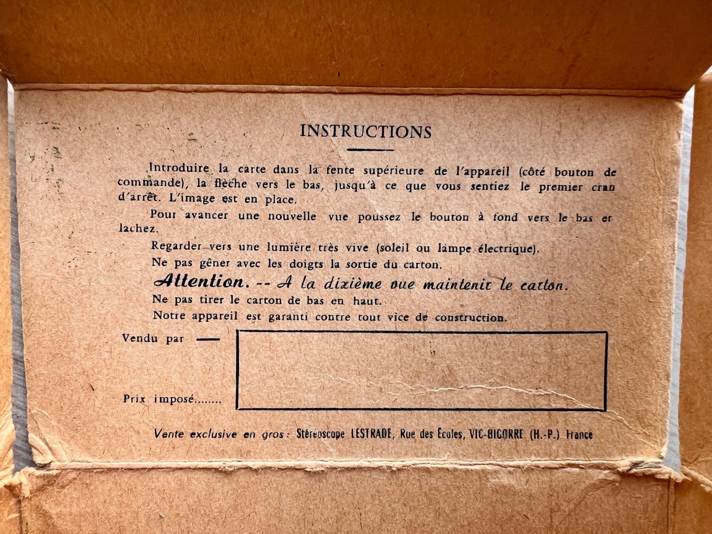 Les premiers stéréoscopes LESTRADE sont commercialisés dans les années 1954. Ils sont présentés dans une petite boîte en carton sous le slogan : "LE RELIEF, LA COULEUR, LA VIE avec le STÉRÉOSCOPE LESTRADE , et ses vues en couleurs". Sur le couvercle se trouve la notice d'utilisation, l'emplacement pour le tampon du revendeur.
