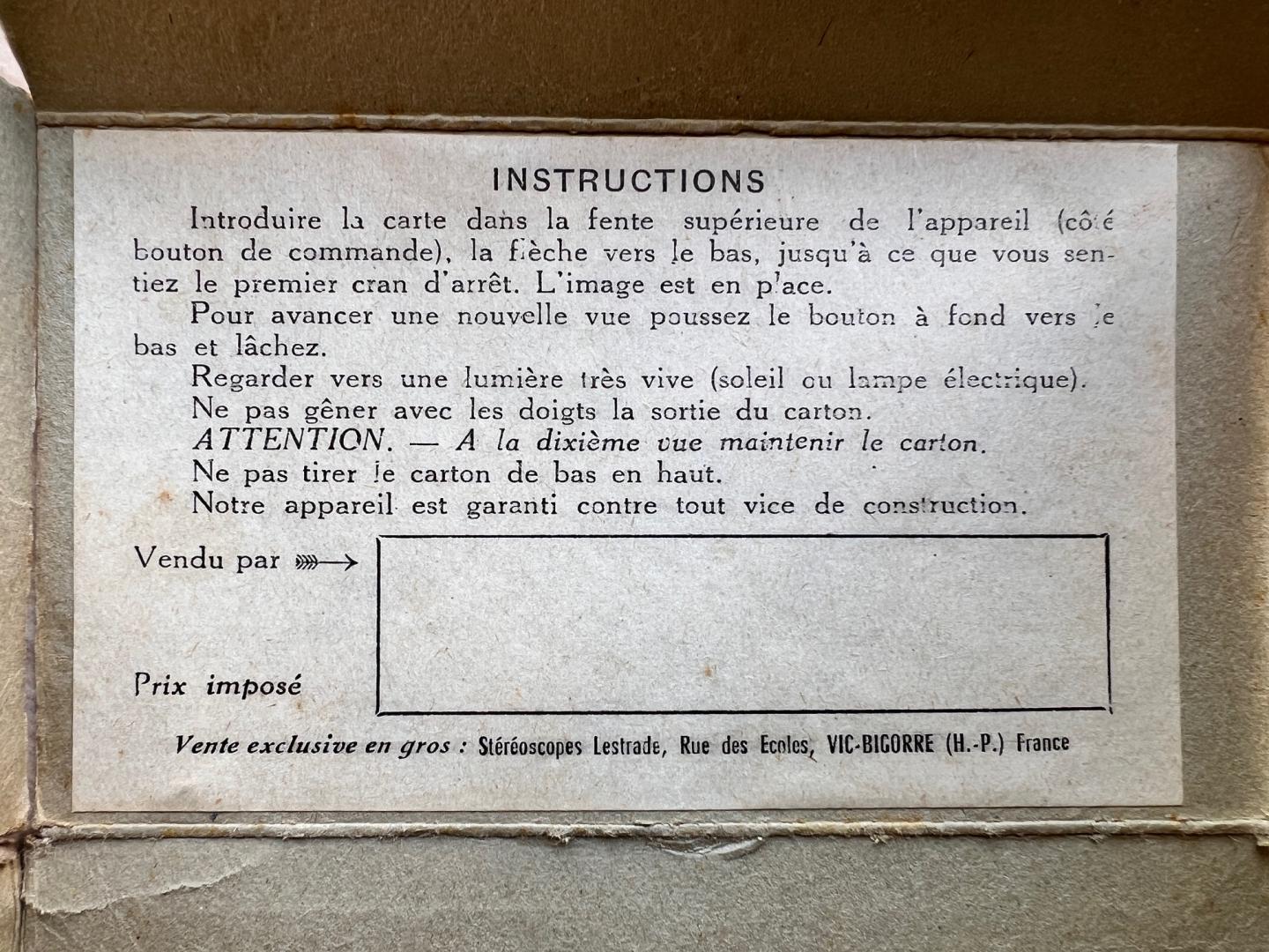 L'appareil standard (en bakélite) est toujours proposé à la vente au prix de 700 anciens francs (environ 14€60), la carte de 10 vues est de 300 anciens francs.(environ 6€30)